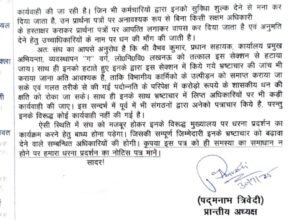 आरोप यह भी है कि वैभव कुमार ने 5 प्रतिशत कोटे के तहत जेई पद पर पदोन्नति से संबंधित फाइलें वर्षों से अपने पास रोक रखी हैं। पदोन्नतियों और अनुमतियों में टाल-मटोल तथा सुविधा शुल्क की मांग की जाती है। संगठन ने मांग की है कि उन्हें तत्काल सेक्शन से हटाकर उनके कार्यकाल की जांच कराई जाए, अन्यथा विभाग मुख्यालय पर धरना-प्रदर्शन किया जाएगा।